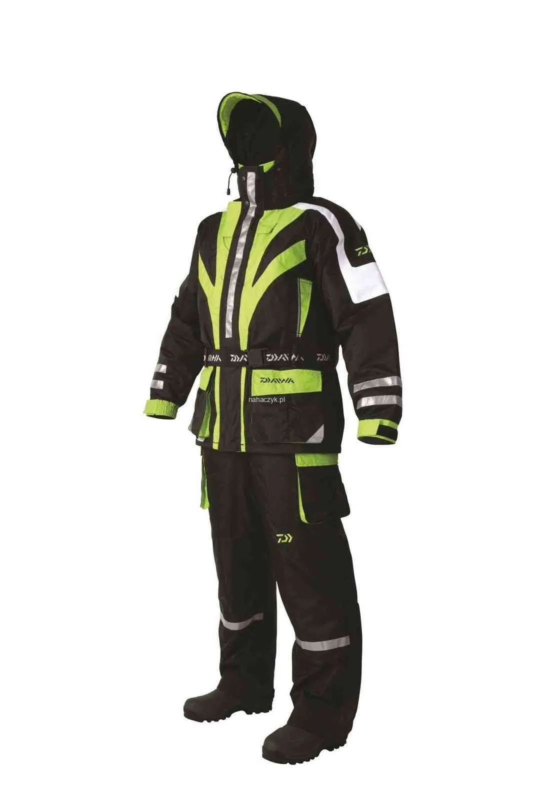 JACKET: Polyester and Tricot body lining, fleece lined collar and hood, reinforced elbows, 2 outer pockets, 2 inner pockets, fleece handwarmers, 2 way YKK main zipper, webbing belt. BIB 'n' BRACE: Waterproof Tussor outer shell. Polyester body lining, polyester quilt insulation, reinforced knees, 2 outer pockets, fleece handwarmers, 2 way YKK zipper, Velcro and zipper ankle adjustment, adjustable cord at waist.