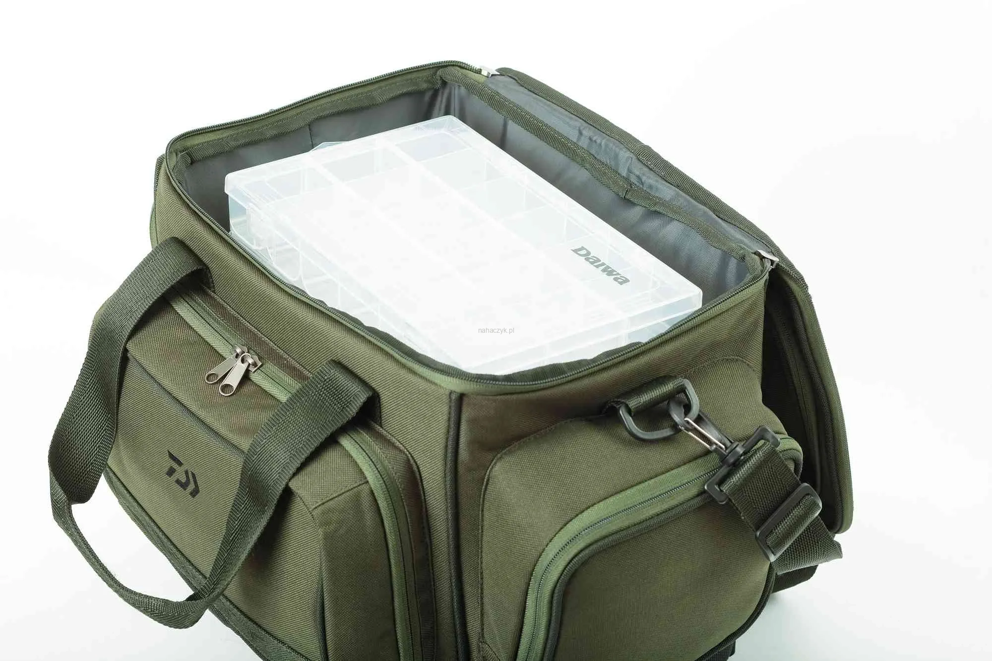 Pojemna torba Carryall z 2 dużymi plastikowymi pudełkami na różnego typu akcesoria w głównej komorze. 2 duże dodatkowe kieszenie po bokach i 1 z przodu na drobny sprzęt. Kieszeń górna dla bezpiecznego przechowywania dokumentów i innych papierów. Ogumowane dno zapobiegające przedostawaniu się wilgoci do wnętrza. Grubo obszyty uchwyt i pas na ramię.