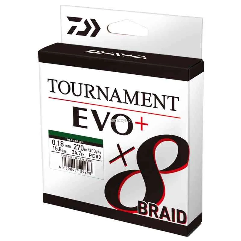 Popularna plecionka Tournament 8 Braid w udoskonalonym wydaniu EVO+. Powłoka powierzchni zyskała większą zawartość silikonu, dzięki czemu generuje jeszcze mniejsze tarcie przy wyrzucie zwiększając osiągane odległości. Dodatkowo zredukowane zostały dźwięki powstające przy przechodzeniu przez przelotki. Nowa Tournament X8 Braid EVO+ technologicznie zalicza się do najbardziej zaawansowanych plecionek dostępnych na światowym rynku. Evo+ nie strzępi się nawet przy częstym i intensywnym użytkowaniu zachowując okrągły splot. W nowych opakowaniach zmniejszyliśmy udział tworzyw sztucznych o 50%. Dostępna w kolorach: ciemnozielonym, chartreuse.