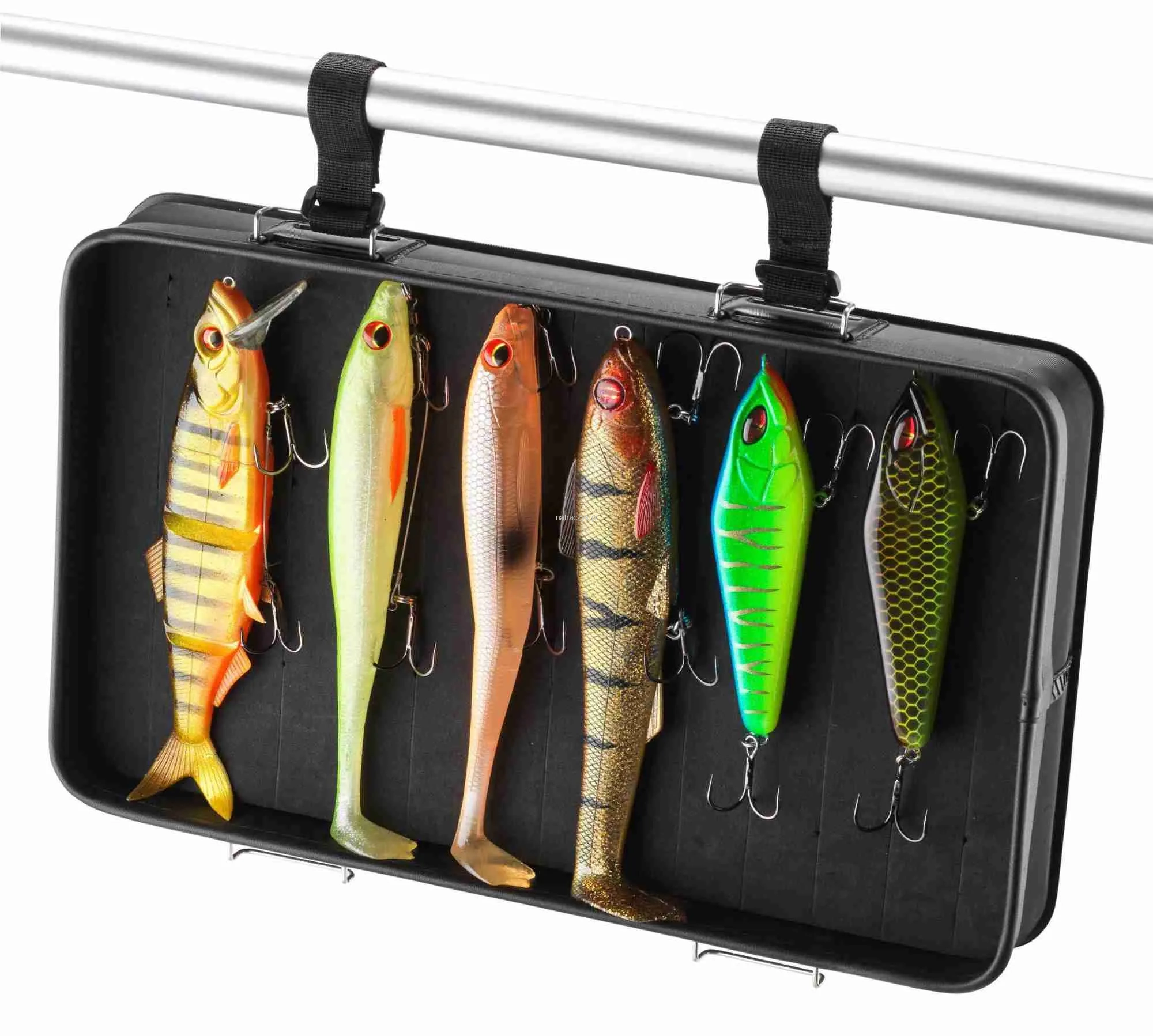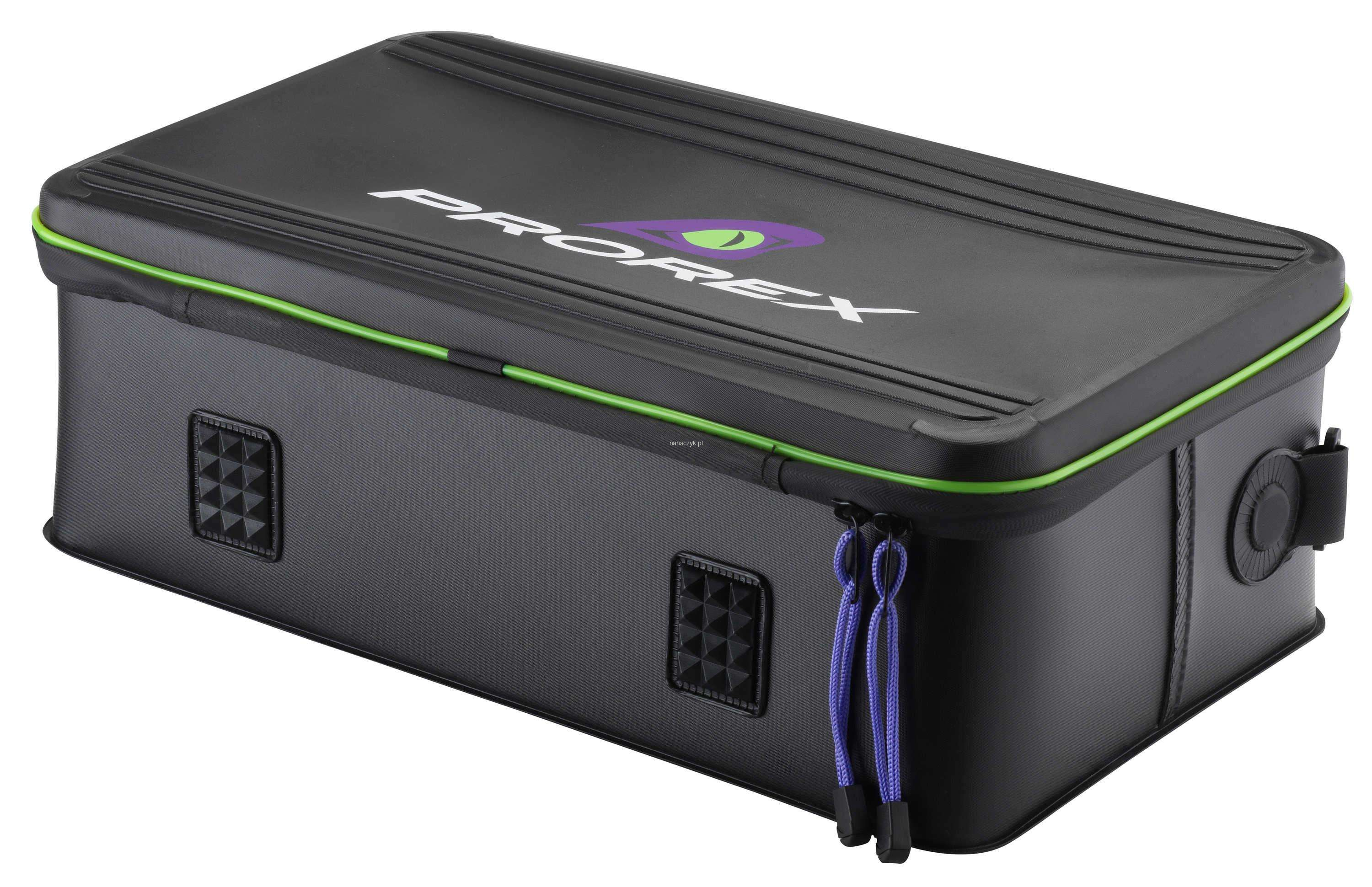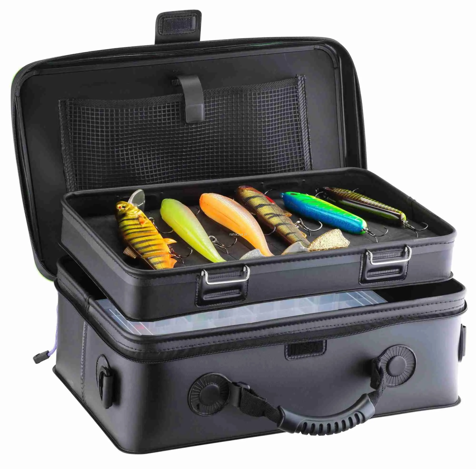 Ta wysokiej klasy torba na akcesoria z solidnego i wytrzymałego materiału EVA pomieści liczne przynęty XL, drobne narzędzia takie, jak szczypce,obcinaczki itp. Optymalna ochrona przed deszczem i rozchlapaną wodą dzięki całkowicie wodoszczelnemu materiałowi. Górna komora wyjmowana - w głównej komorze poniżej zmieści się jedno duże pudełko do 10 cm wysokości oraz sporo drobiazgów. Górna część wyposażona jest w grubą wkładkę EVA, do której przymocować można do 16 uzbrojonych przynęt do ok.28 cm. Dzięki niej można zawczasu przygotować zestaw wabików, które planujemy wykorzystać w dniu połowu. Jest to bardzo wygodny sposób przechowywania umożliwiający szybki i łatwy dostęp do przynęt. Ta komora posiada dwa pasy z zapięciami, które pozwalają przymocować ją np. do relingu. Siatkowa kieszeń w deklu na dokumenty, klucze itp. Szeroki pas na ramię zapewnia optymalny komfort noszenia. Dostarczana bez zawartości.