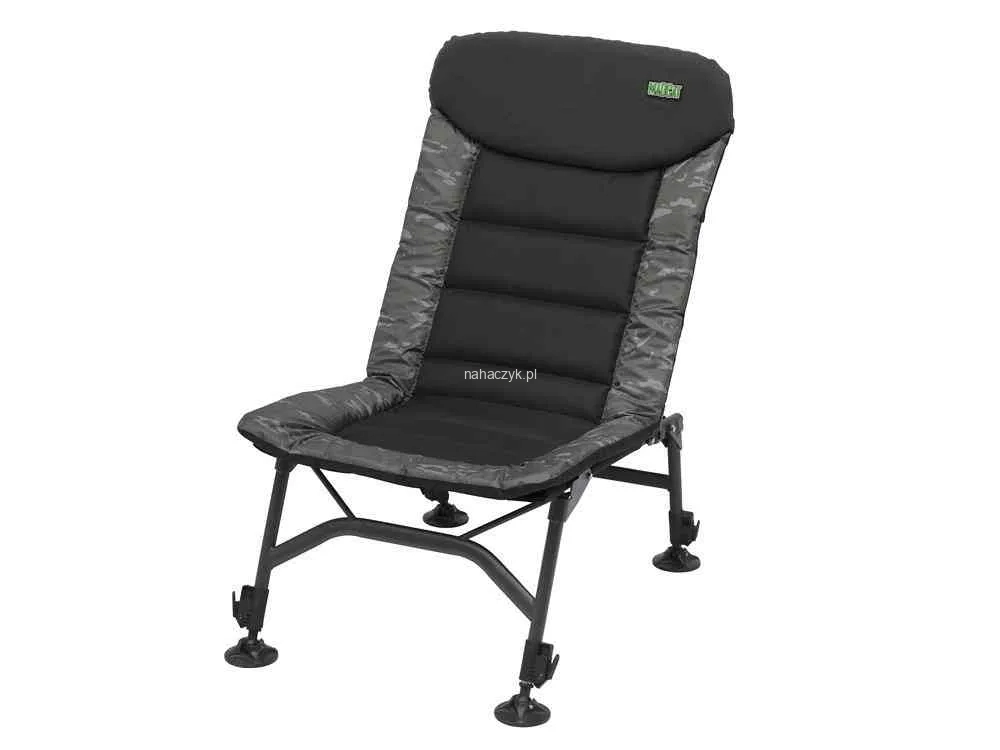 Solidne, mocne i wygodne stalowe krzesło z regulowanymi nogami, z zamkami bezpieczeństwa, zakończonymi dużymi nakładkami błotnymi. Posiada wygodną poduszkę z polaru. Atrakcyjnie zaprojektowane z oryginalnym kamuflażem MADCAT CamoFish.
