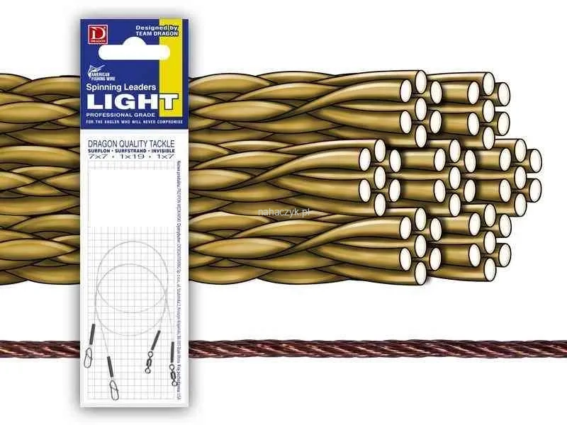 Przypony w kolorze jasnobrązowym, bez powłoki nylonowej. 49 supercienkich włókienek splecionych ze sobą tworzy miękką linkę, która nie wypływa zupełnie na pracę prowadzonej przynęty. Wytrzymałości od 6 do 30kg. Długości od 15 do 40cm. Opakowanie zawiera 2 sztuki przyponu stalowego.