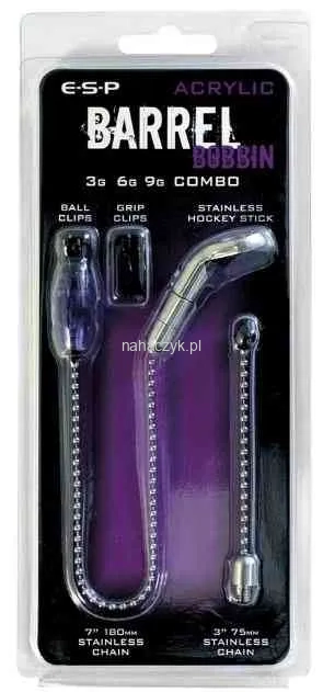 Sygnalizator brań ESP  BARREL BOBBINS dostępny w siedmiu kolorach –teflonowe: biały oraz akrylowe: czerwony, niebieski, fioletowy, pomarańczowy, zielony i żółty. Wszystkie elementy, oprócz łańcuszków są zrobione w fabryce w Wielkiej Brytanii, gwarantując wyjątkową jakość i precyzje. Nierdzewne łańcuszki posiadają na jednym końcu plastikowy łącznik, natomiast na drugim metalowy o wadze 3 g. Pozwała to na łatwe dodanie wagi do sygnalizatora, poprzez odwrócenie łańcuszka. Co więcej, zakładając dodatkowe obciążenie od podpórki Hockey Stick, ciężar zwiększa się o kolejne 3 g, co znaczy, że można użyć teflonowego Bobbina o wadze: 5 g, 8 g i 11 g oraz akrylowych: 3 g, 6 g i 9 g. Sprawia to, że zestaw jest bardzo uniwersalny. Posiada dwa zestawy klipsów.