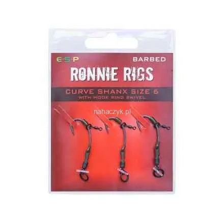 Gotowe zestawy Ronnie z hakami Cryogen Curve Shanx. Dzięki płynnemu obrotowi o 360 stopni, zestawy Ronnie ESP zapewniają optymalny potencjał zaczepienia i idealną prezentację. Ronnie Rigs zawiera antypoślizgowy uchwyt Grip Stop, obrotowy pierścień haka i szybkozłączkę Uni-Link oraz niezwykle ważny hak Cryogen Curve Shanx.
