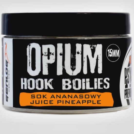 Boilies Opium Hook Genlog jest to nowa generacja przynęt. Tonące haczykowe kulki proteinowe wykonane w technologii dzięki której kulki uzyskują specjalną strukturę, która bardzo szybko oddaje atraktory i aromaty zawarte w mieszance, co sprzyja szybszym braniom ryb. Kulki Opium skomponowane zostały z najlepszych składników wysokobiałkowych i wzbogacone naturalnymi oleoryzynami. Seria Opium Hook jest to przynęta wyprodukowana miedzy innymi z mączek organizmów wodnych występujących w naturalnym środowisku. Produkt ten odbył szereg testów na różnego rodzaju łowiskach w całej Europie, sprawdzając się znakomicie. Produkt ten polecany jest przez karpiarzy dla karpiarzy szukających produktów z najwyższej półki w atrakcyjnej cenie. Przynęty te są łowne przez cały rok.