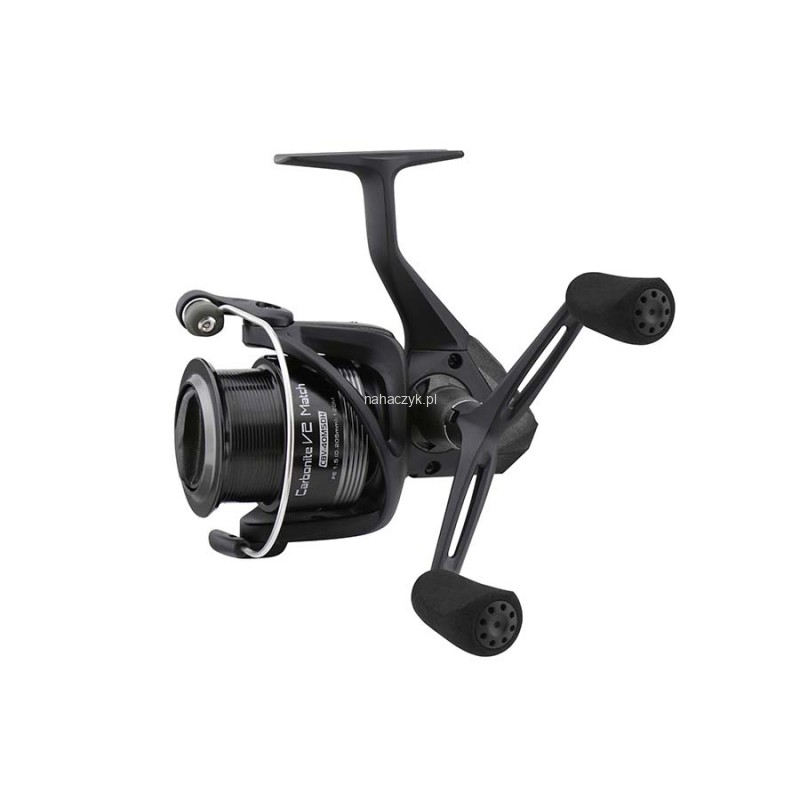 Kołowrotek Carbonite V2 Match wyposażony został w odporny na korozję grafitowy korpus, aluminiową szpulę typu Match w dwóch odcieniach oraz trwałą metalową podwójną korbę.