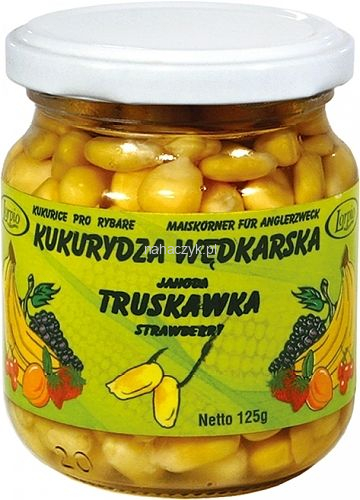 Twarda, wyselekcjonowana aromatyzowana pewnie trzymająca sie haczyka kukurydza bez zalewy Lorpio w zakręcanym słoiku. Z dodatkiem aromatu truskawki.