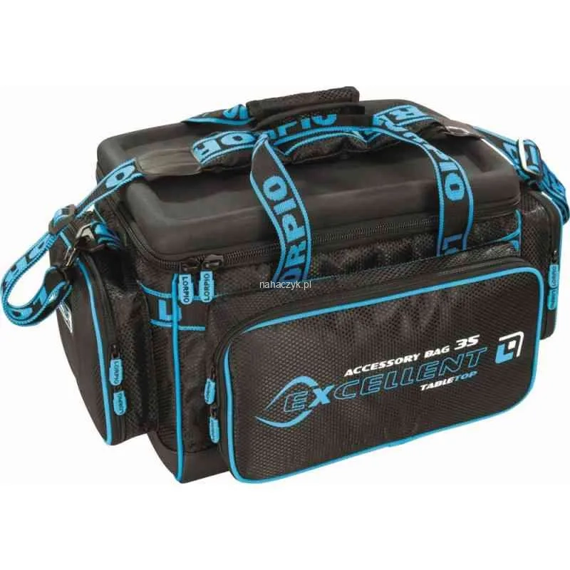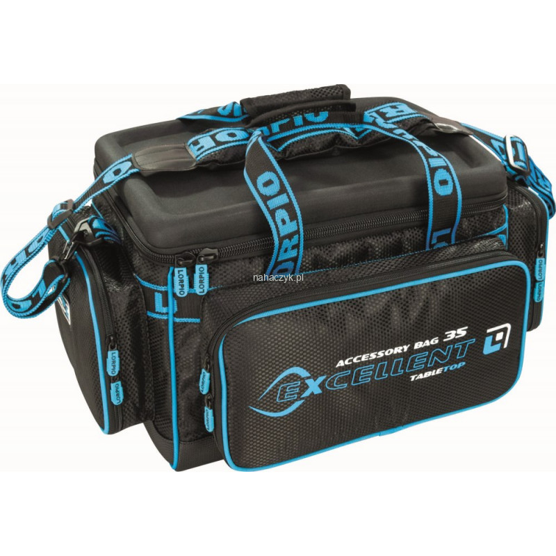 Uniwersalna torba dla wszystkich wędkarzy. Twardy dekiel oraz wewnętrzne pionowe usztywnienia zamontowane we wszystkich rogach dają możliwość wykorzystania torby jako stolik. Wszystkie wewnętrzne ściany, dno oraz dekiel wypełniony pianką dla lepszej ochrony sprzętu. Dwie boczne kieszenie oraz przednia na różne akcesoria.