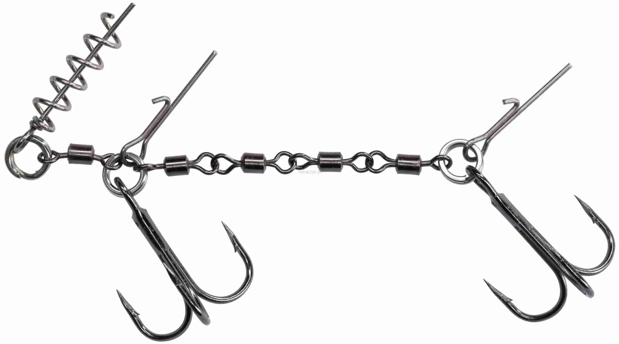 Podwójna dozbrojka z wkrętem i pinami. Zastosowanie kilku krętlików pozwoliło uzyskać bardzo mocne połączenie, które eliminuje możliwość wytworzenia zjawiska dźwigni podczas holu, dodatkowo stabilizując gumę. Rozmiar XL dedykowany do największych przynęt