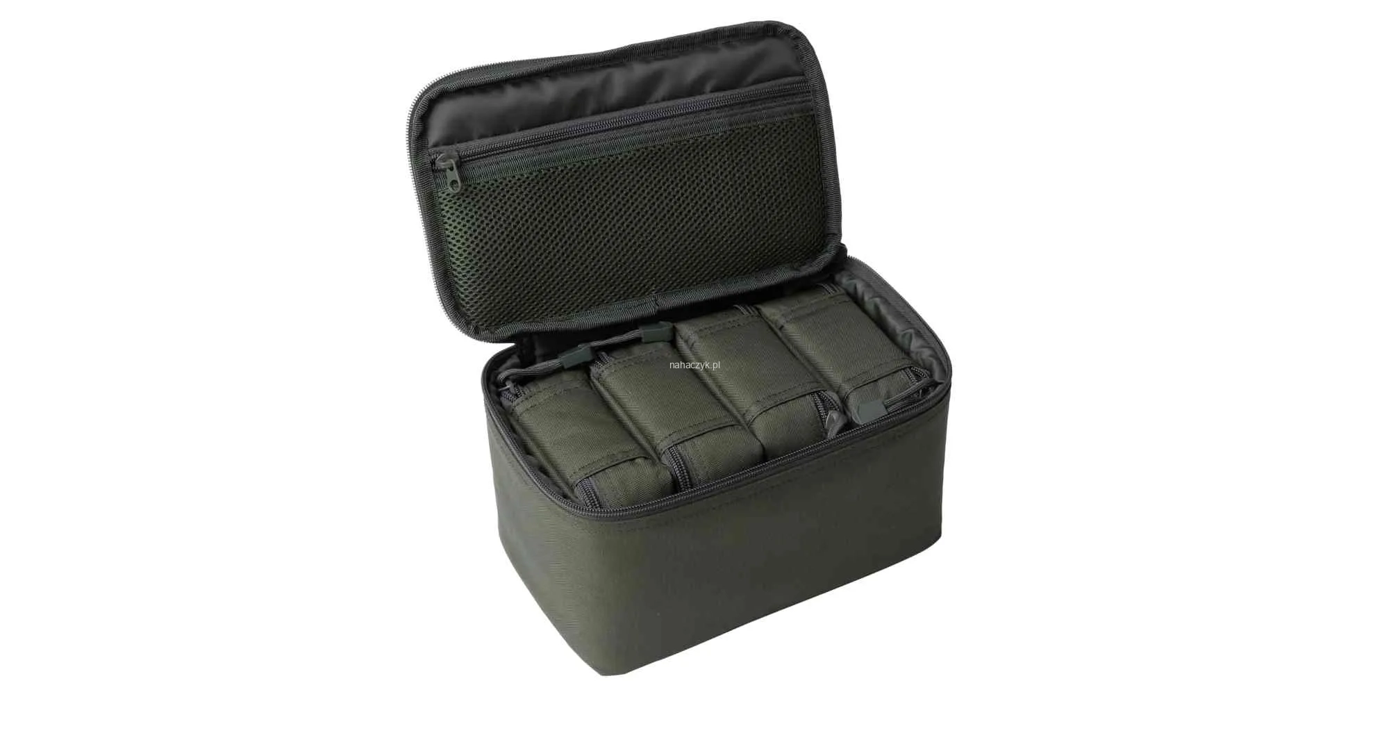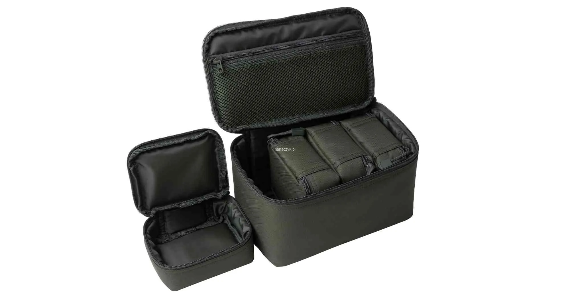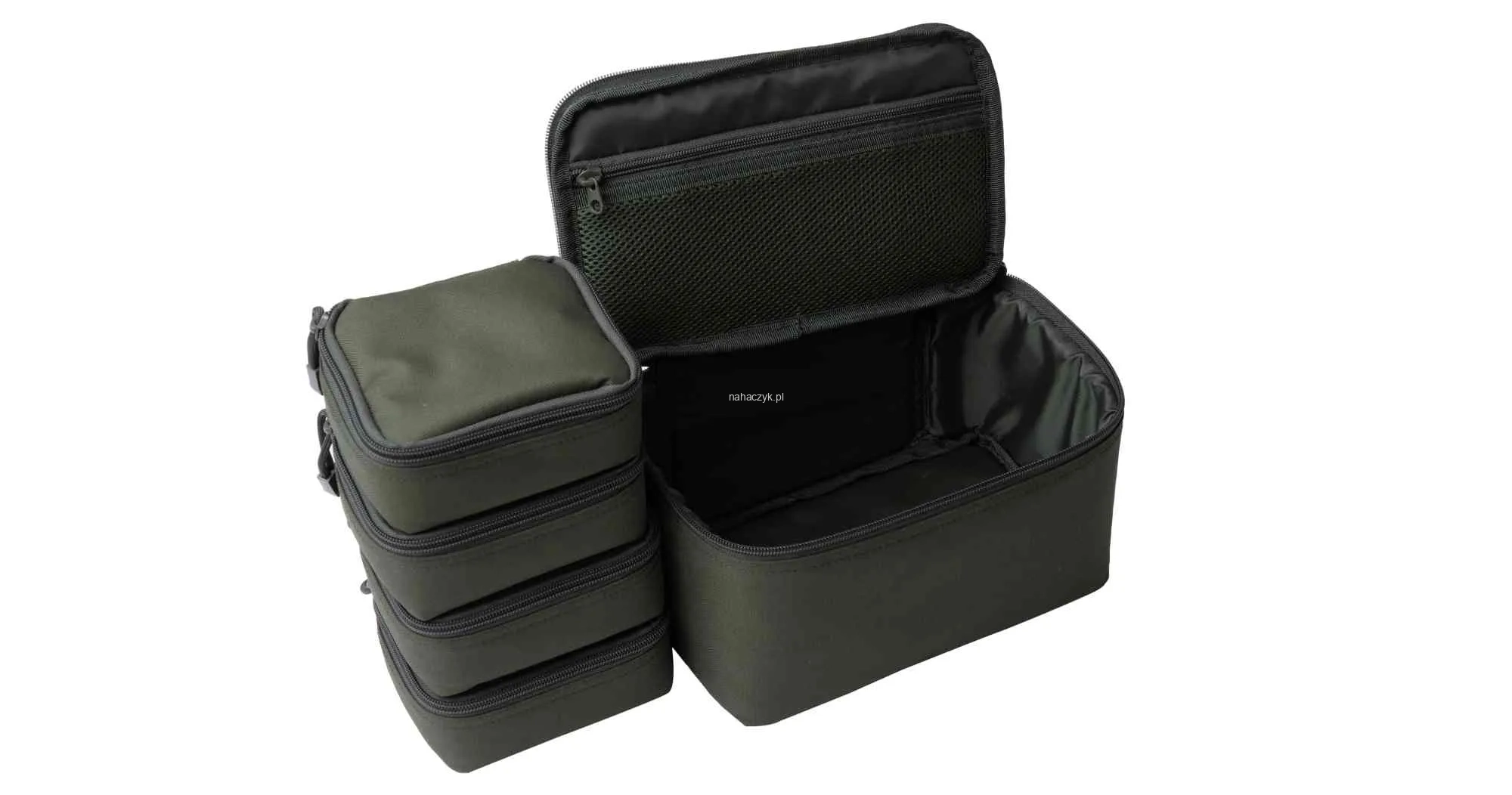 Zestaw czterech drobnych kuferków na najmniejsze akcesoria, zapakowanych w jednej większej torbie. Świetna organizacja drobnego sprzętu, np. ciężarków, haczyków czy wszelkich akcesoriów niezbędnych przy produkcji zestawów karpiowych