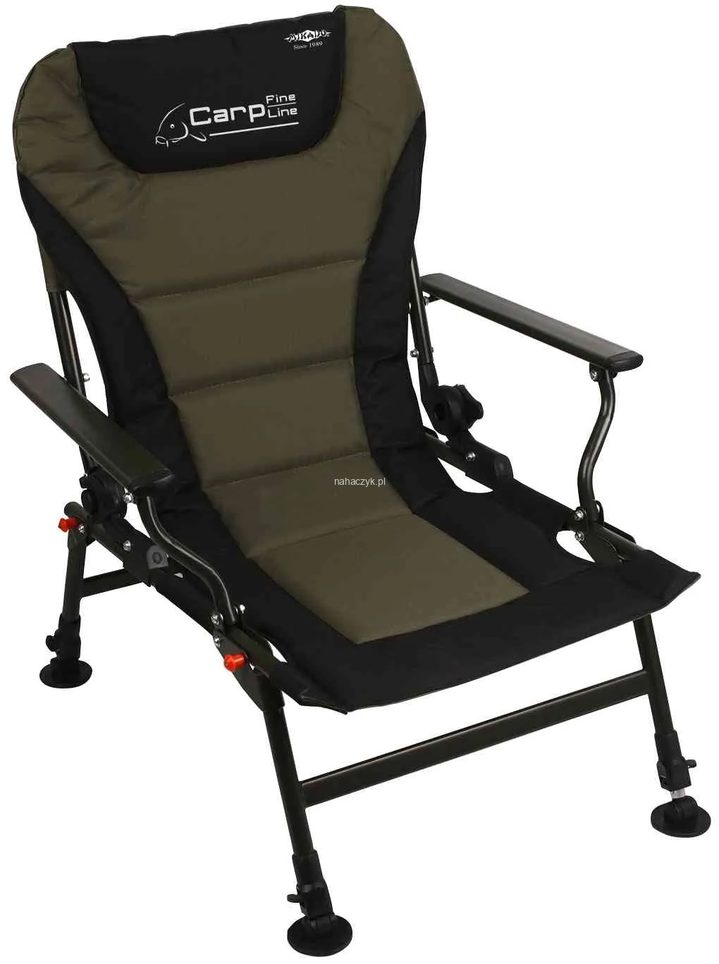 Wygodny, składany fotel karpiowy z podłokietnikami i regulacją kąta oparcia. Posiada blokadę teleskopowych nóżek i obszycie z wysokiej jakości materiału odpornego na przetarcia