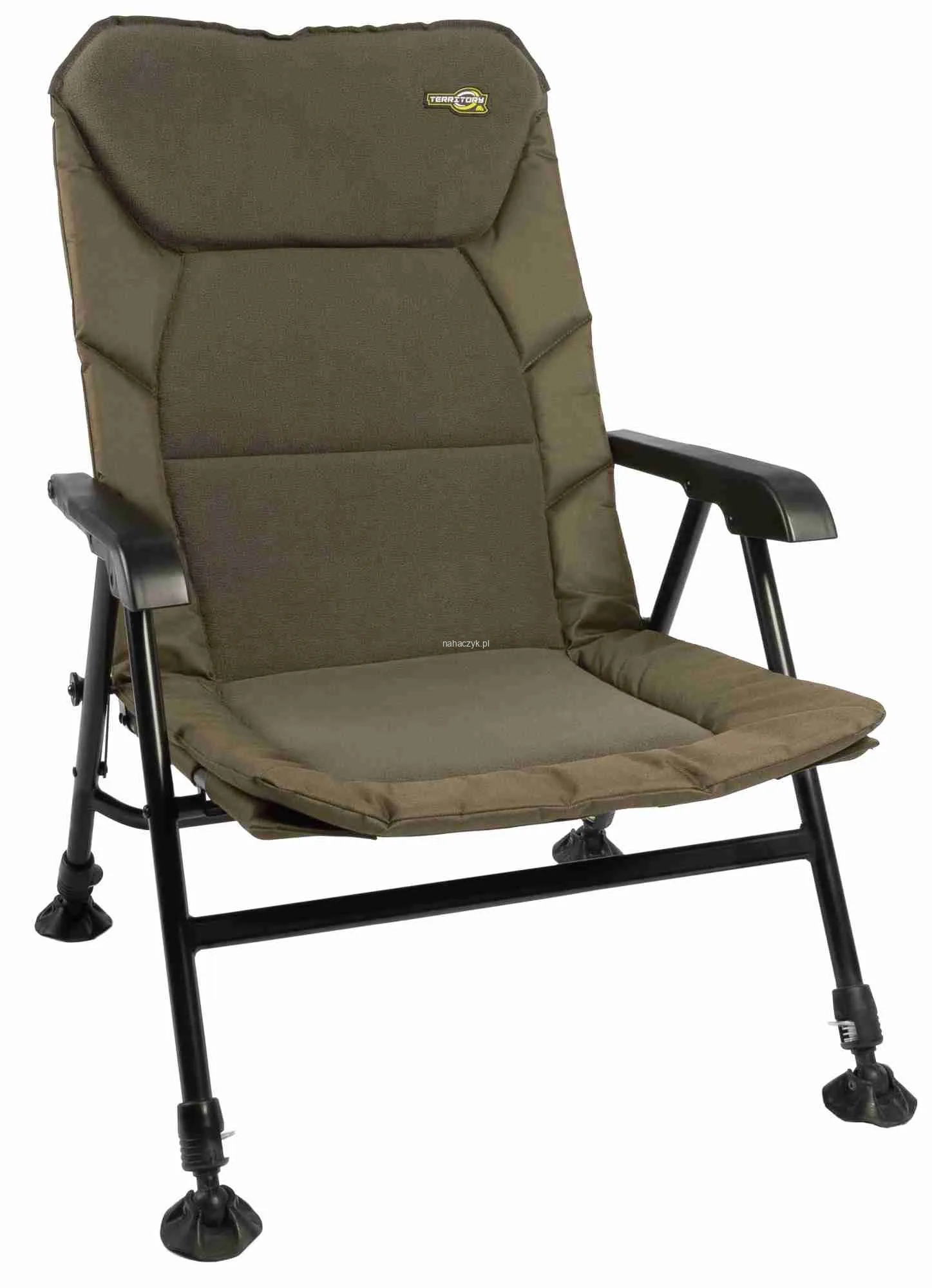 Klasyczny fotel z regulowanymi nogami i wygodnym, sztywnym oparciem. Materac wykończony polarem zapewnia niezbędny komfort podczas zasiadki, a stelaż testowany był przy masie aż 150kg.