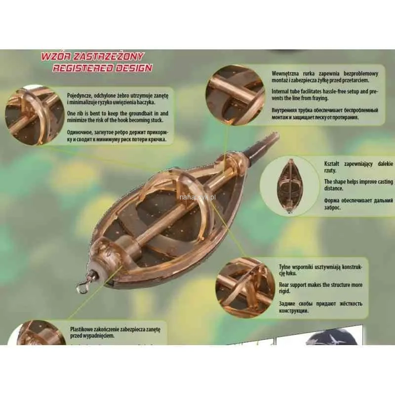 Koszyczek Douglas to kolejny przełomowy koszyczek dedykowany do połowów na większych głębokościach. Ulepszona, żebrowana konstrukcja idealnie utrzymuje zanętę. Aerodynamiczny kształt gwarantuje dalekie rzuty. Plastikowe zakończenie zabezpiecza karmę przed wypadnięciem przy uderzeniu w wodę.Tak. Pomyśleliśmy o wszystkim.