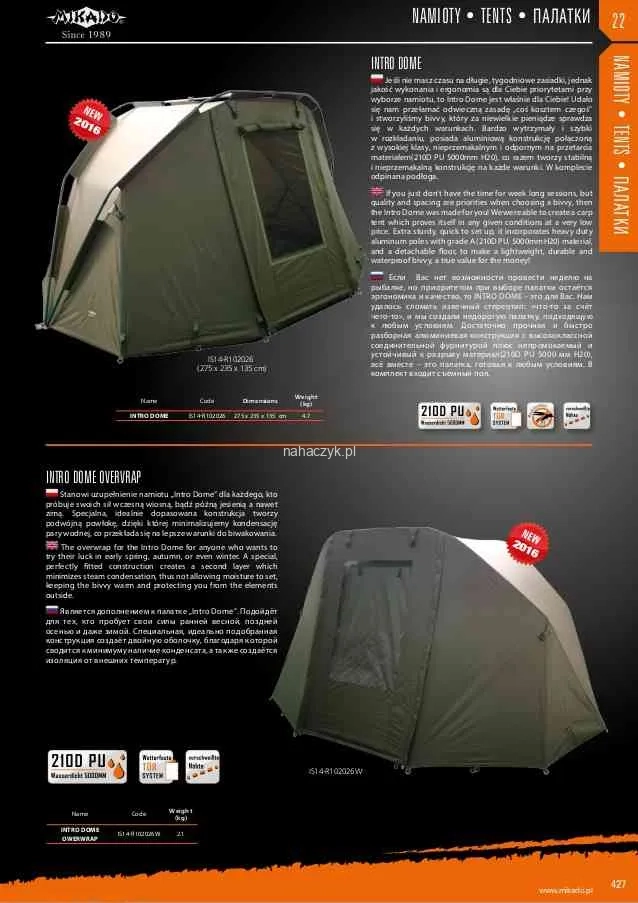 Jeśli nie masz czasu na długie, tygodniowe zasiadki, jednak jakość wykonania i ergonomia są dla Ciebie priorytetami przy wyborze namiotu, Intro Dome jest właśnie dla Ciebie! Udało się nam przełamać odwieczną zasadę „coś kosztem czegoś” i stworzyliśmy bivvy, który za niewielkie pieniądze sprawdza się w każdych warunkach. Bardzo wytrzymały i szybki w rozkładaniu, posiada aluminiową konstrukcję połączoną z wysokiej klasy, nieprzemakalnym i odpornym na przetarcia materiałem(210D PU 5000mm H20), co razem tworzy stabilną i nieprzemakalną konstrukcję na każde warunki. W komplecie odpinana podłoga.