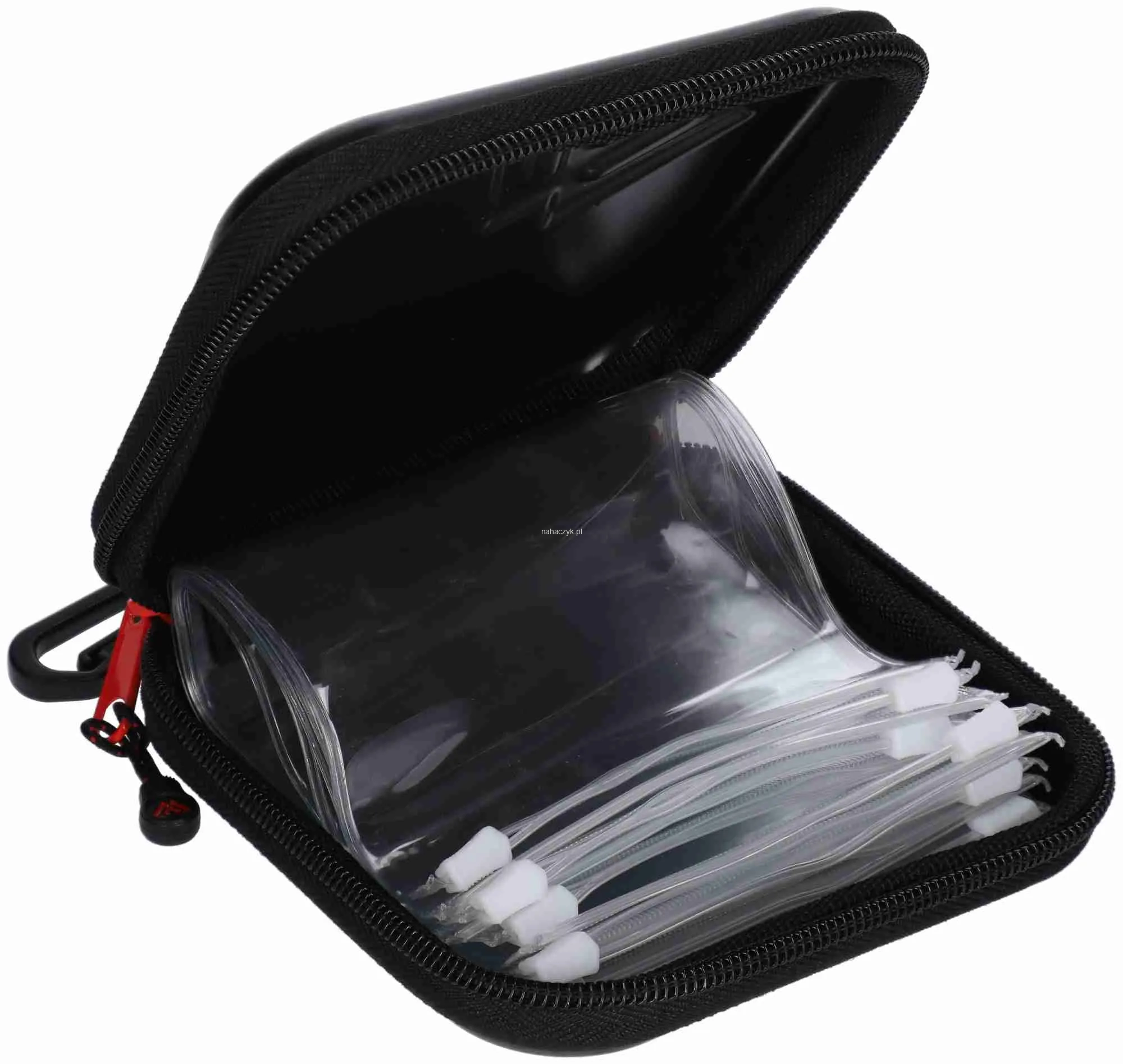 Sztywny portfel wyposażony w torebki z suwakiem, które pozwalają w łatwy i zorganizowany sposób przechowywać drobne akcesoria, przypony i małe przynęty sztuczne. Specjalny karabińczyk umożliwia dopięcie porfela do torby bądź paska.