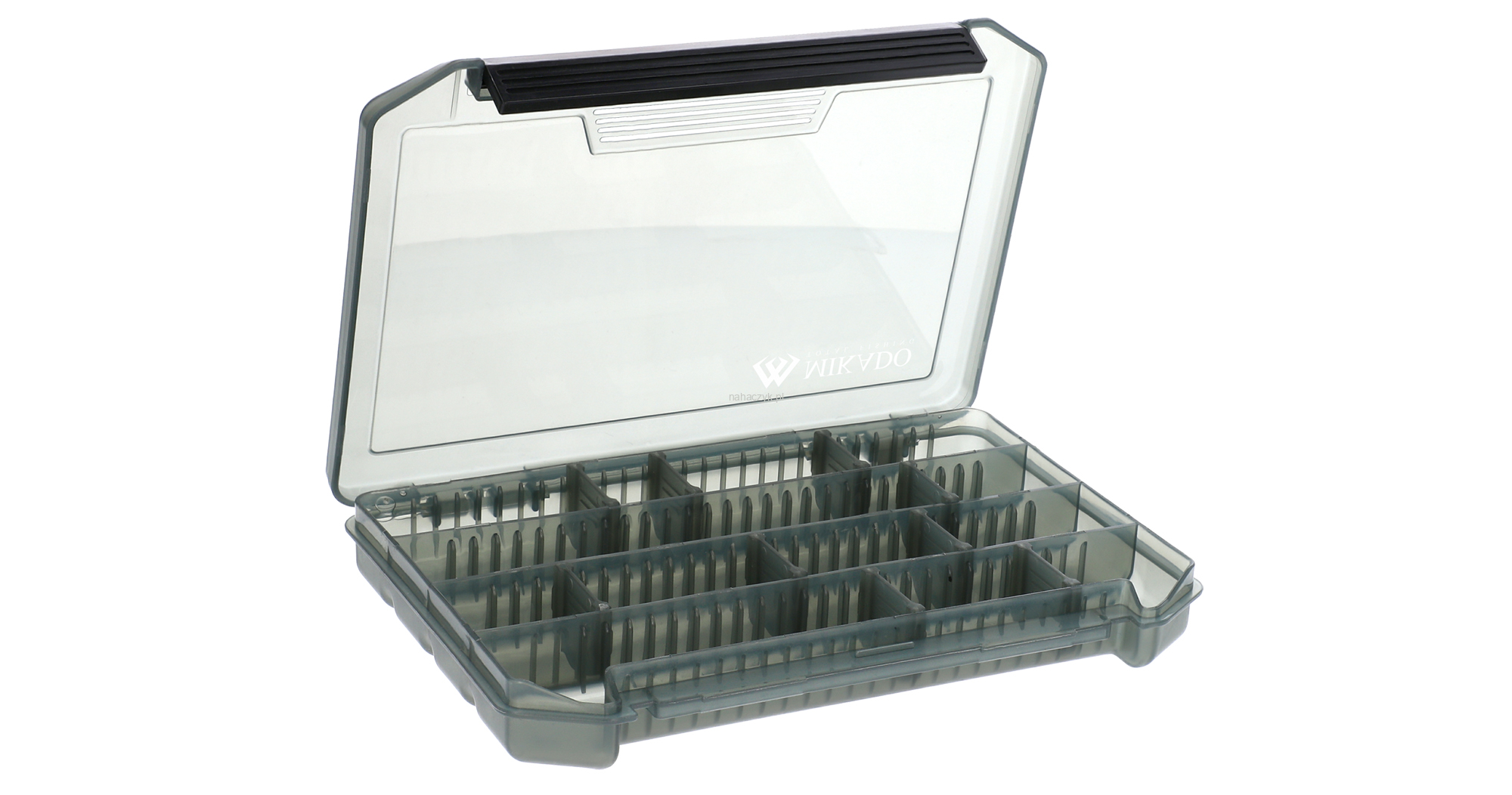 Wysokiej jakości kompaktowe pudełko wędkarskie w kolorze czarnym. Posiada regulowane przegródki oraz mocne jednostronne zamknięcie. Specjalna, płytka konstrukcja idealnie sprawdzi się do przechowywania mniejszych gum oraz drobnych akcesoriów
