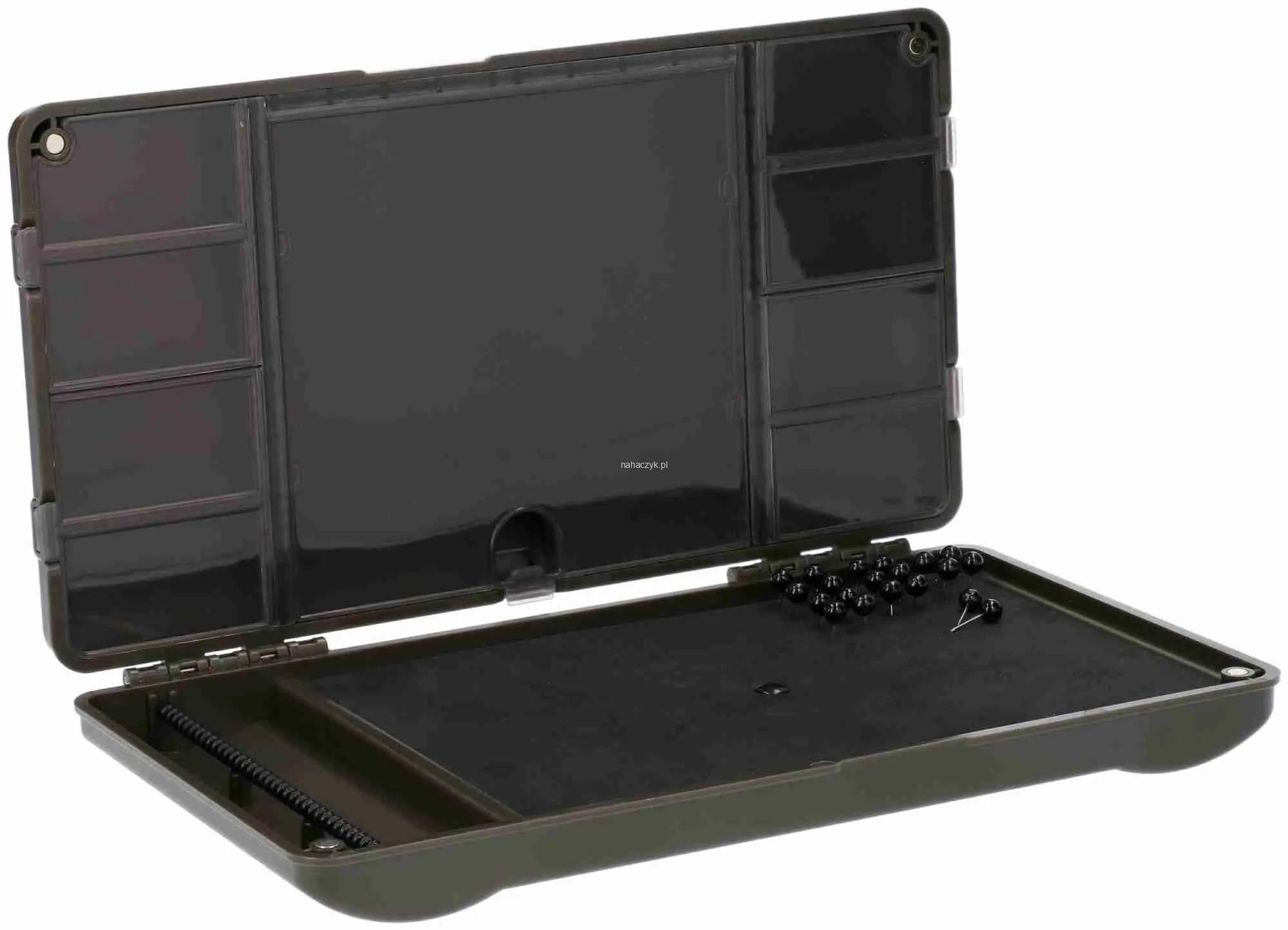 Specjalistyczne pudełko karpiowe z systemem przegródek i magnesów. Wyposażone w dodatkową piankę oraz szpilki do wiązanych przyponów, oraz cały zestaw drobnych przegródek na akcesoria niezbędne podczas wędkowania.