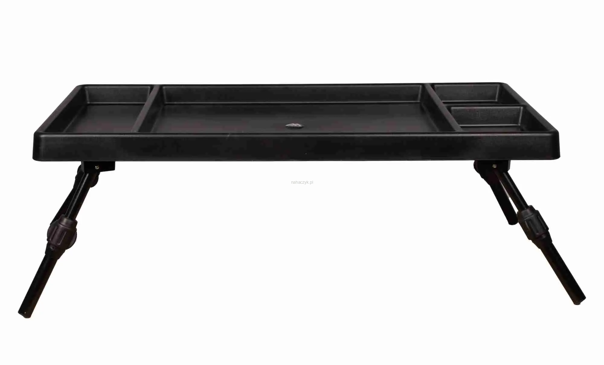 Klasyczny stolik karpiowy wykonany z mocnego i elastycznego tworzywa PP. Wyposażony w 4 regulowane nóżki i specjalnie wyprofilowany blat z komorami na drobne akcesoria.