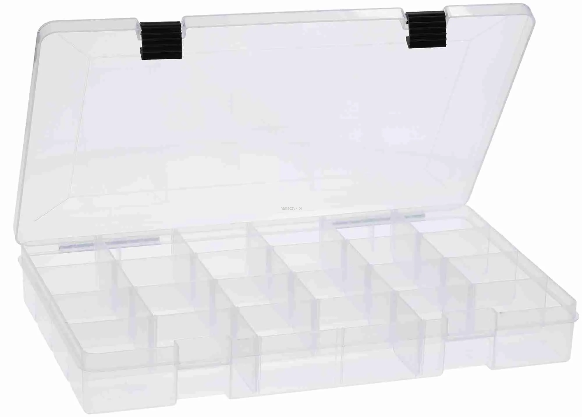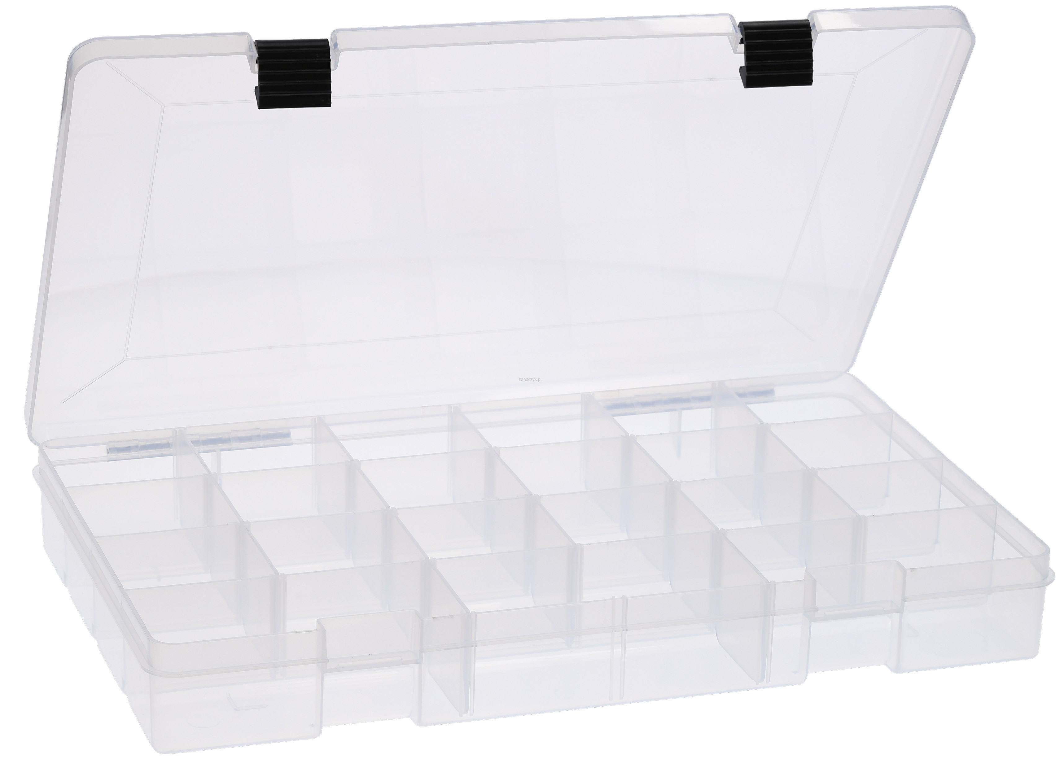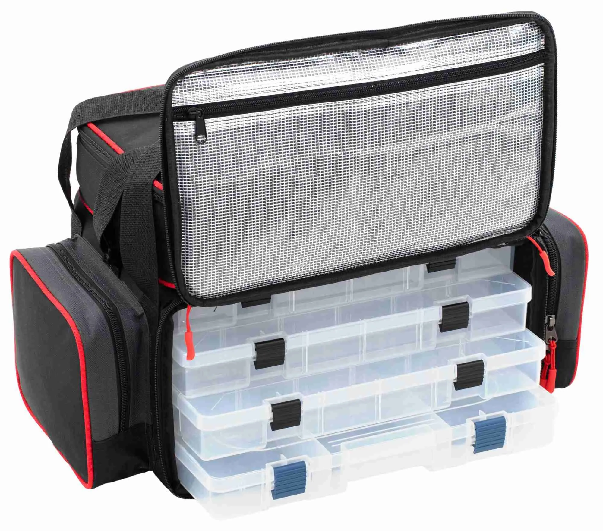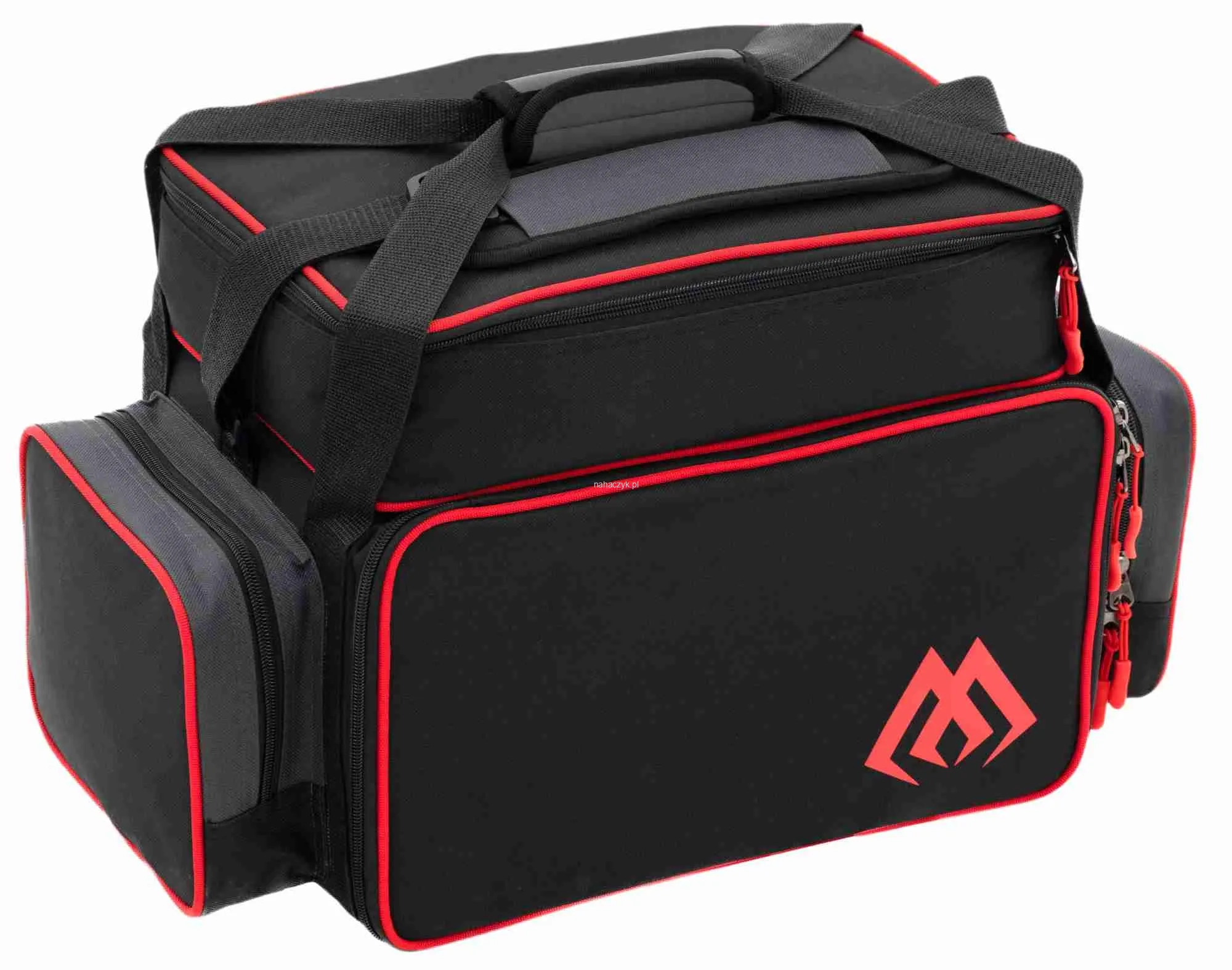 Duża torba z pudełkami, paskiem na ramię i rączką, podzielona na dwie komory główne. Górna część idealna sprawdzi się do przechowywania większych przedmiotów, dolna komora wyposażona w pudełka dedykowana jest do przechowywania akcesoriów oraz przynęt.