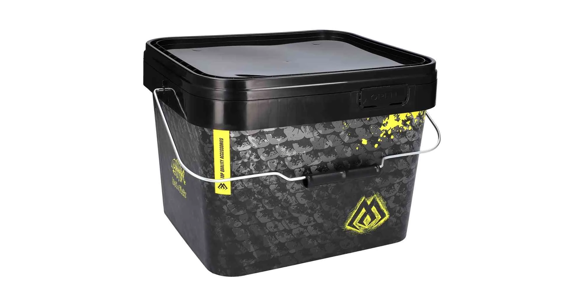 Uniwersalne wiadro na przynęty i zanęty. Wykonane z odpornego tworzywa, wyposażone w pokrywkę i metalową rączkę. Pojemność to 10l, a prostokątny kształt ułatwia lokowanie wiadra w bagażniku samochodu.