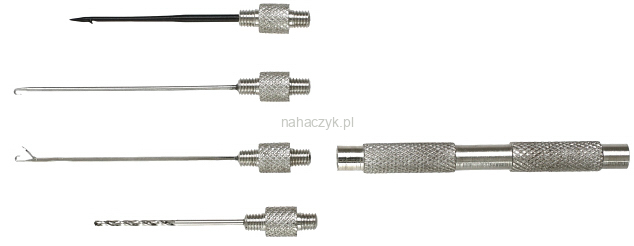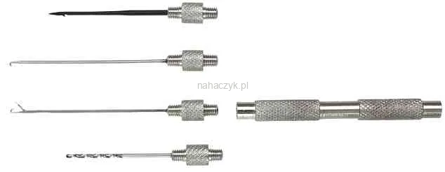 Kompletny i kompaktowy zestaw aluminiowej rączki i końcówek wyposażonych w różne igły oraz wiertło do uzbrajania przyponów karpiowych w przynęty.