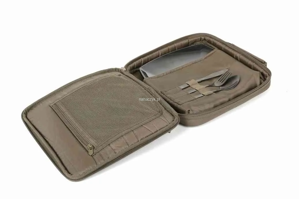 Bezkompromisowa jakość – wędkarski odpowiednik jadalnianej porcelany. Bogato wypełniona torba na zamek zawiera żaroodporny talerz, zestaw nierdzewnych, czarnych sztućców. Mocna, wodoodporna podstawa wyposażona jest w kieszonkę na przyprawy.