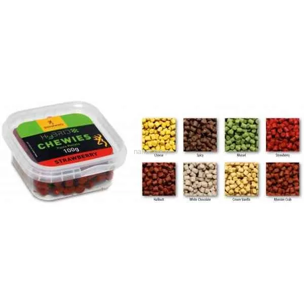 Miękkie pellety to udowodniona przynęta „zabójca“ i to nie tylko na karpia, ponieważ leszcz, lin, a nawet duża płoć wyrobiły sobie na nie smak. Hybrid Chewies maja 8 mm i dostępne są w ośmiu kombinacjach smak/kolor, zostały gruntownie przetestowane tak, aby były odpowiedniej konsystencji i twardości na haczyk i przypon z włosem. Zapakowane w zamykanych, oszczędzających miejsce pudełkach po 100 g - doskonałe, gdy wędkarz chce mieć wybór rożnych przynęt pod ręką.