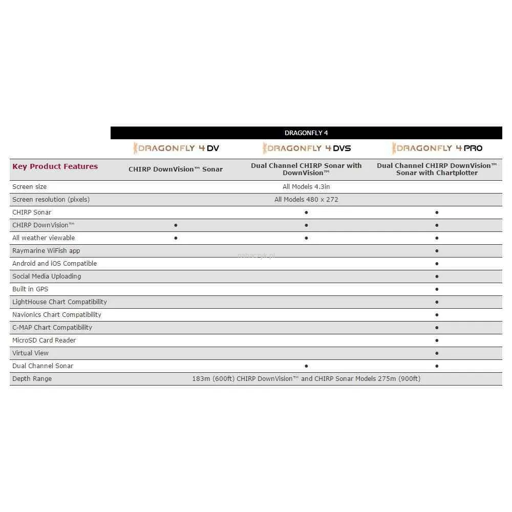 Urządzenia Dragonfly wyposażone są w niezwykle jasne ekrany (1500 nit). Optycznie zespolone ekrany o dużym kontraście są doskonale widoczne w każdych warunkach pogodowych zapewniając jaśniejsze kolory, większy kontrast, lepsze kąty widzenia i brak zaparowań. Regulowana podstawka umożliwia pochylanie i obracanie urządzenia. Dzięki małej powierzchni podstawy, można ją zamontować prawie w każdym miejscu na łodzi. Dostępne są również inne opcje montażu dzięki produktom firm Scanstrut i RAM Mount (m. in. montowanie na relingu lub przylepne).