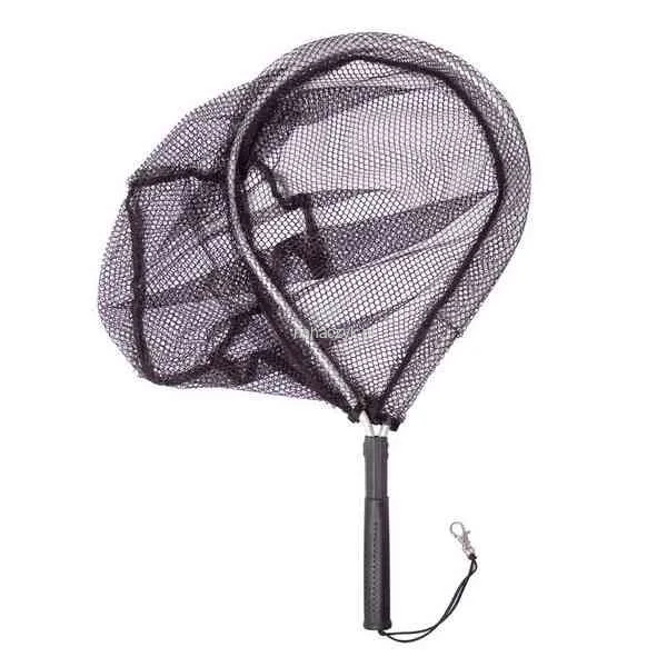 Bardzo praktyczny podbierak dla muszkarzy i spinnigistów. Nienasiąkliwa, szybko-schnąca gumowana siatka minimalizuje zaczepiania się zestawów i sztucznych przynęt. Półokrągła rama podbieraka wyłożona jest gąbką (nie tonie) jest na tyle duża że wraz z pojemnym głębokim