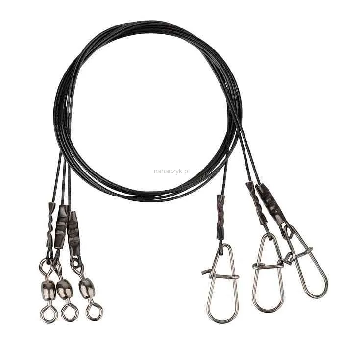 Super wytrzymałe 7 zwojowe linki stalowe, pokryte mocnym, czarnym kopolimerem, zapewniającym doskonałą odporność na przetarcie! Idealnie dobrane krętliki i agrafki ze sprężystej stali, nadają się do twardych i miękkich przynęt! Doskonałe przypony szczupakowe!
