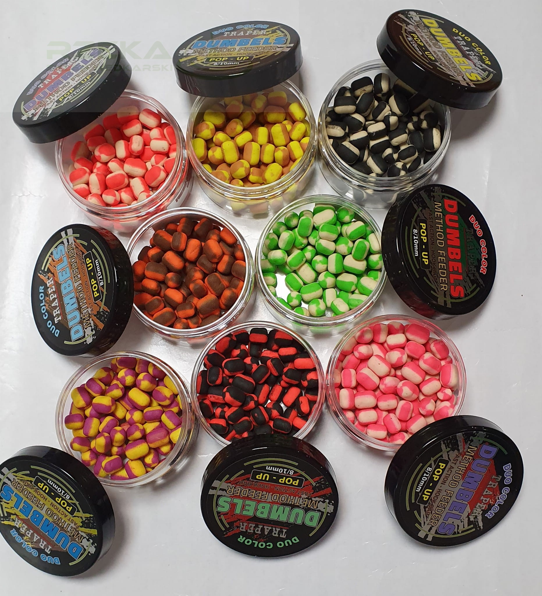 Bardzo atrakcyjna, dwukolorowa przynęta, w której zastosowano kompozycję dwóch różnych zapachów. Dzięki zastosowaniu naturalnych składników najwyższej jakości oraz procesowi zaawansowanej technologii produkcji Dumbels Duo Color zaskakuje szybkością działania przewyższając tym inne przynęty. Odpowiednia wielkość, różnorodność kolorów, wyrafinowane zapachy, właściwości stopniowego uwalniania aromatu i składników to główne zalety tego produktu. wszystkie te cechy dają gwarancję skuteczności. Szczególnie polecane na łowiska poddane dużej presji wędkarskiej oraz akweny komercyjne.