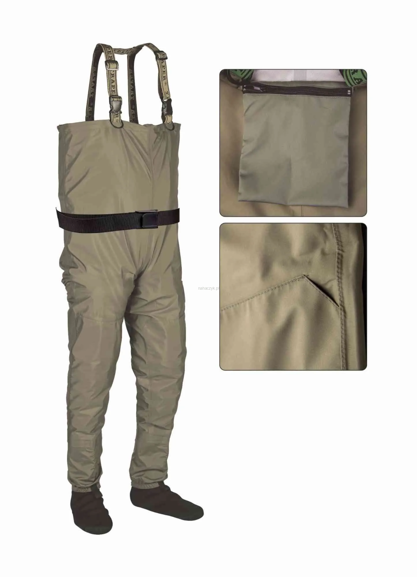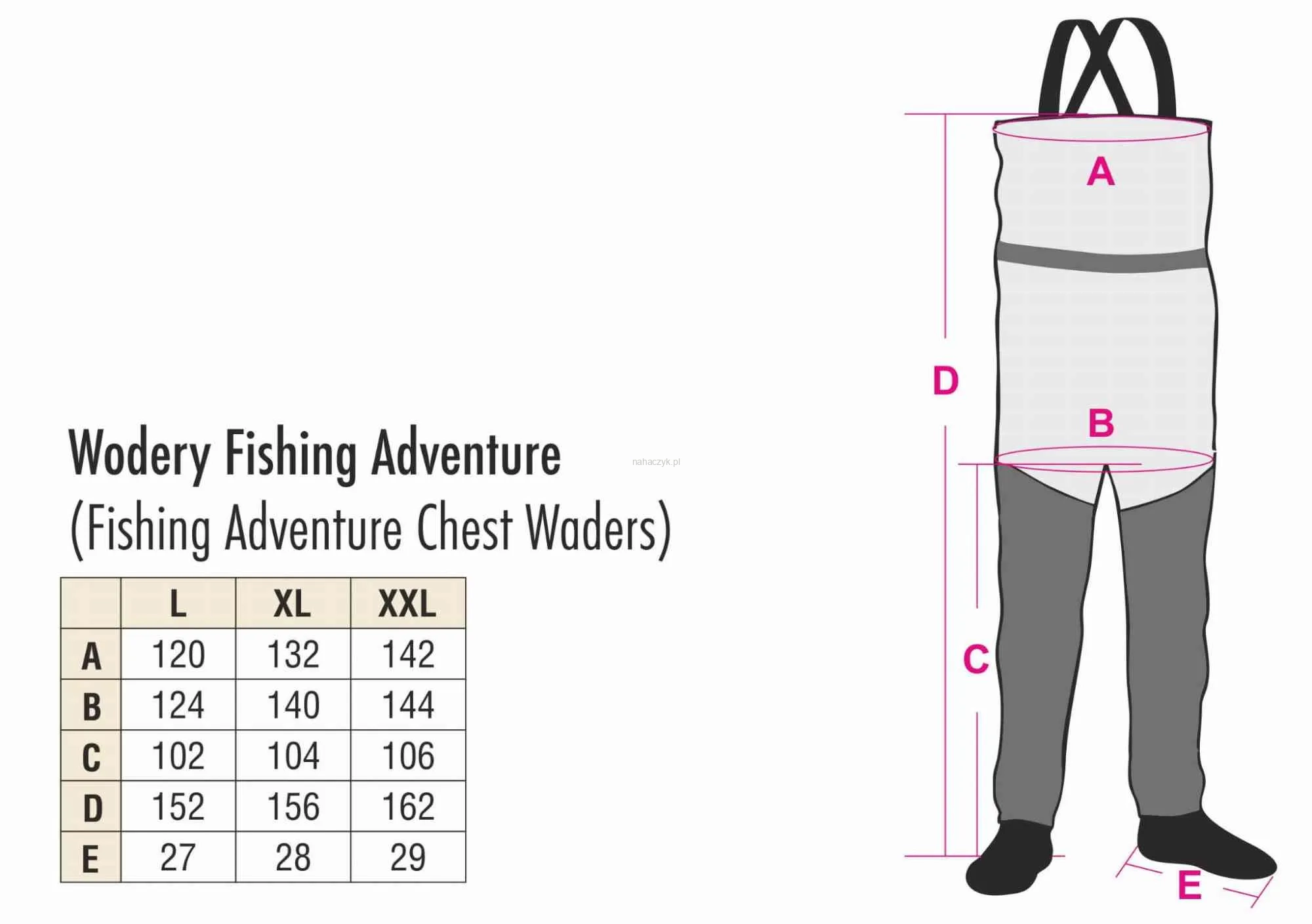 Wodery Fishing Adventure stanowią połączenie dwóch najważniejszych zalet: wodoodporności i oddychalności. Tkanina, z której są wykonane jest bardzo elastyczna i wytrzymała. Stwarza poczucie przyjemnego chłodu latem. Przednia, dolna część woderów jest wzmocniona drugą warstwą materiału, co dodatkowo chroni przed uszkodzeniem. Neoprenowe skarpety chronią stopy przed otarciami i zimnem. W dolnej części nogawek znajdują się zaczepy, łączące śpiochy z butami. Regulowane, elastyczne, szerokie szelki i zamykana kieszeń wewnętrzna, dopełniają całości.