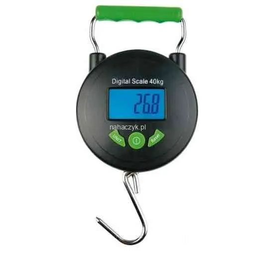 Waga elektroniczna do 40 kilogramów. Oprócz ważenia informuje nas o aktualnie panującej temperaturze. Posiada również miarkę. Bardzo mocny stalowy pierścień i hak, ułatwiają ważenie ryb.Wykonana jest z mocnego i trwałego tworzywa