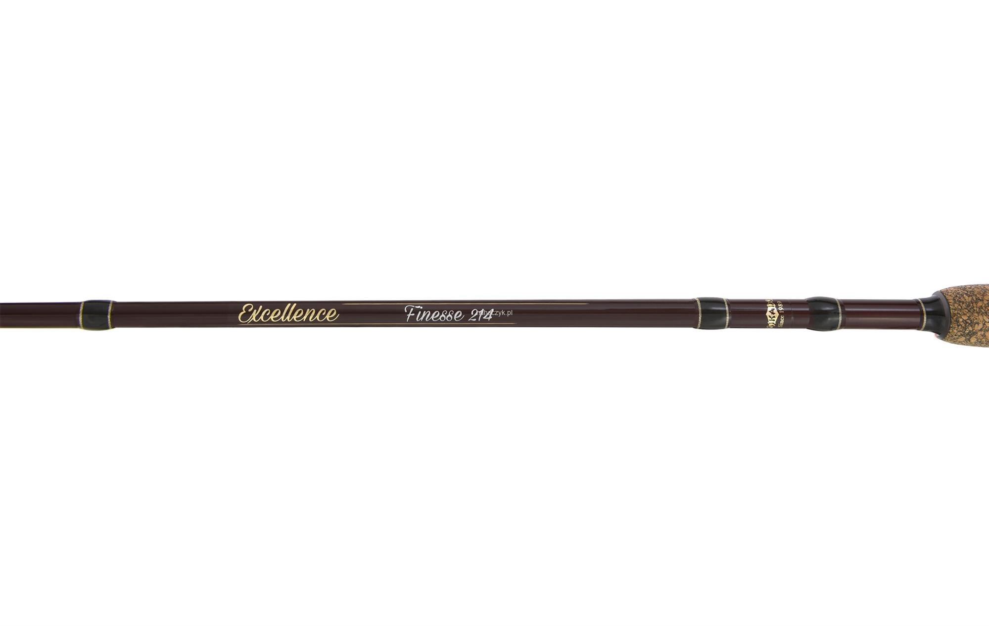 Wędka MIKADO Excellence Finesse o długości 214 cm i ciężarze wyrzutu od 2 do 7 g, tak jak pozostałe kije z serii, to bardzo smukły i czuły blank wykonany z wysokomodułowego włókna węglowego, wyposażony dodatkowo we wklejaną, pełną, szczytówkę, która perfekcyjnie przekazuje nawet najdelikatniejsze skubnięcia ryb. Najwyższej klasy uchwyt, posiadający specjalne otwory poprawiające kontrolę podczas prowadzenia przynęty oraz bardzo wytrzymałe przelotki, jest gwarancją funkcjonalności podczas łowienia i pewności podczas holu. Model o długości 214 cm, tak jak wszystkie pozostałe wędki z serii, jest to tzw. "dwuskład", czyli wędka dwusekcyjna, która po złożeniu osiąga długość transportową 110,5 cm.