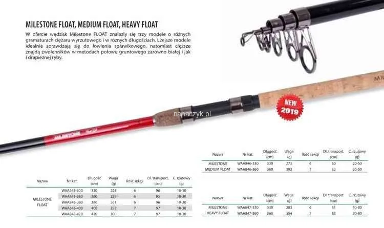 W ofercie wędzisk Milestone FLOAT znalazły się trzy modele o różnych gramaturach ciężaru wyrzutowego i w różnych długościach. Lżejsze modele idealnie sprawdzają się do łowienia spławikowego, natomiast cięższe znajdą zwolenników w metodach połowu gruntowego zarówno białej i jak i drapieżnej ryby.