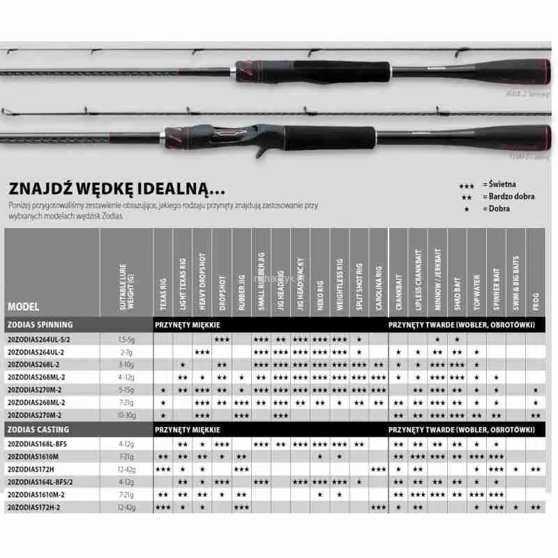 Shimano Zodias 2020 to profesjonalne wędziska spinningowe i baitcastingowe, które wprowadziliśmy do oferty z myślą o wędkarzach preferujących szybkie, japońskie modele wędek.Nowy Zodias to tak naprawdę kwintesencja tego, co w wędziskach Shimano najlepsze. Łączy w sobie nowoczesny, agresywny design, topowe technologie produkcji blanku, świetne komponenty i odpowiednio dobrane rodzaje akcji. W ofercie znajduje się kilkanaście modeli, odpowiednich do lekkich zastosowań spinningowych oraz lekkich i średnich odmian łowienia z użyciem multiplikatora.Sekretem rewelacyjnej pracy tego wędziska jest przede wszystkim lekki i smukły blank, wykonany w opatentowanej przez Shimano technologii HI-POWER X.