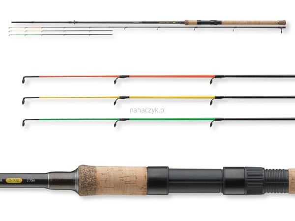 Wyposażone w 3 wymienne drgające szczytówki (1x włókno węglowe, 2x włókno szklane) i smukłą korkową rękojeść.