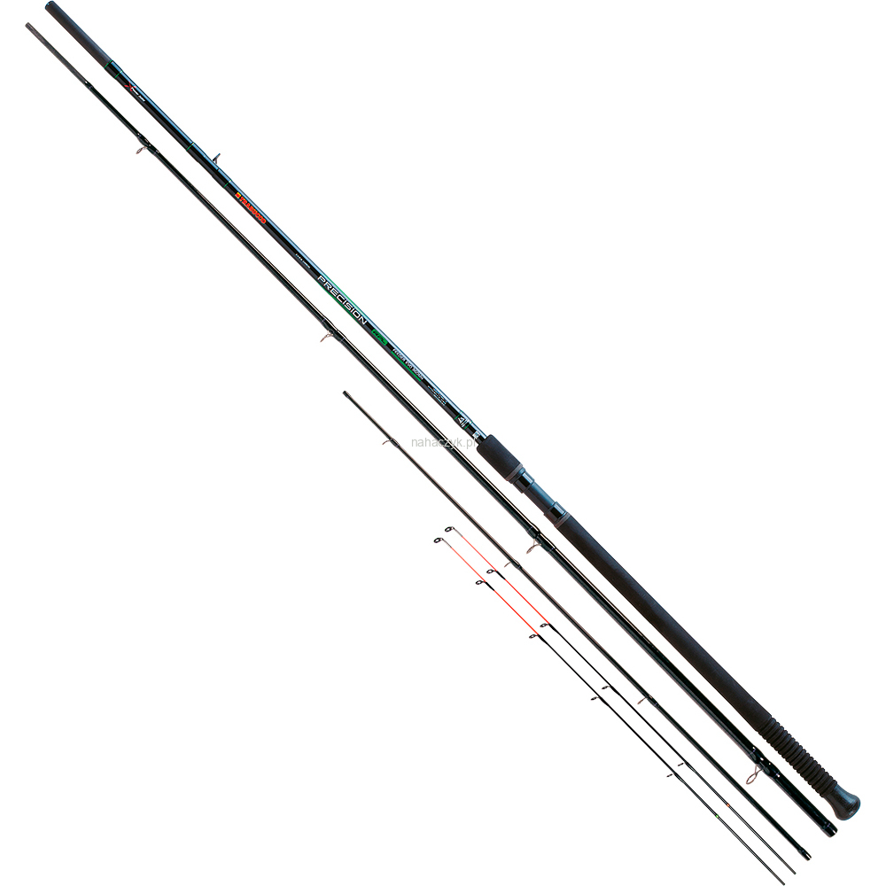 Mocna, progresywna akcja, zaprojektowana do łowienia z koszykami 90–120 g. Blank wykonany z węgla S.H.M.R. Wzmacniane złącza elementów. 2 szczytówki o akcji mocnej (szklana) i bardzo mocnej (węglowa), obie po 60 cm o dobrej czułości. Rękojeść kryta pianką EVA zakończona prążkowanym uchwytem i okrągłym gumowym korkiem. Skręcany uchwyt kołowrotka, zintegrowany z rękojeścią. Przelotki S-SiC na podwójnej stopce (pojedyncza na szczytowych elementach).