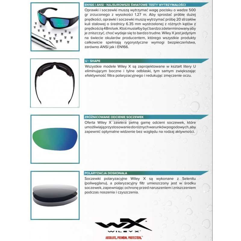 Soczewki polaryzacyjne Wiley X są wykonane z Selenitu (poliwęglanu), a polaryzacy