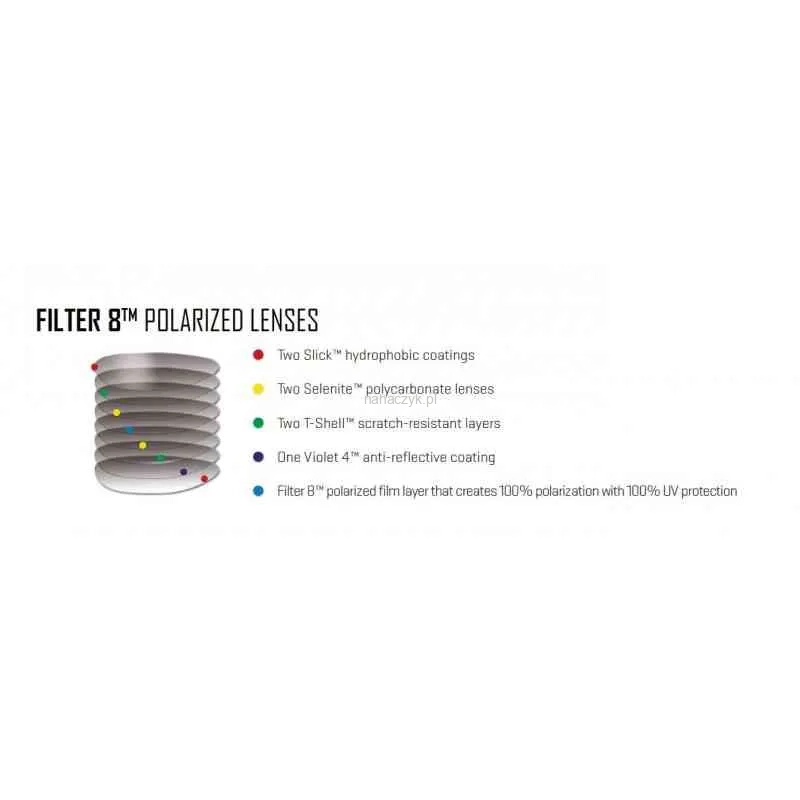 Wszystkie polaryzacyjne soczewki Wiley X są produkowane z ośmiu warstw ochronnych dla optymalnego widzenia. Poza właściwościami antyrefleksowymi i odpornymi na zarysowania, Wiley X umieszcza swoją polaryzacyjną warstwę pomiędzy dwie warstwy poliwęglanowe. Ta dodatkowa cecha przedłuża trwałość polaryzacyjnej warstwy i chroni ją przed zniszczeniem i zarysowaniem podczas czyszczenia.